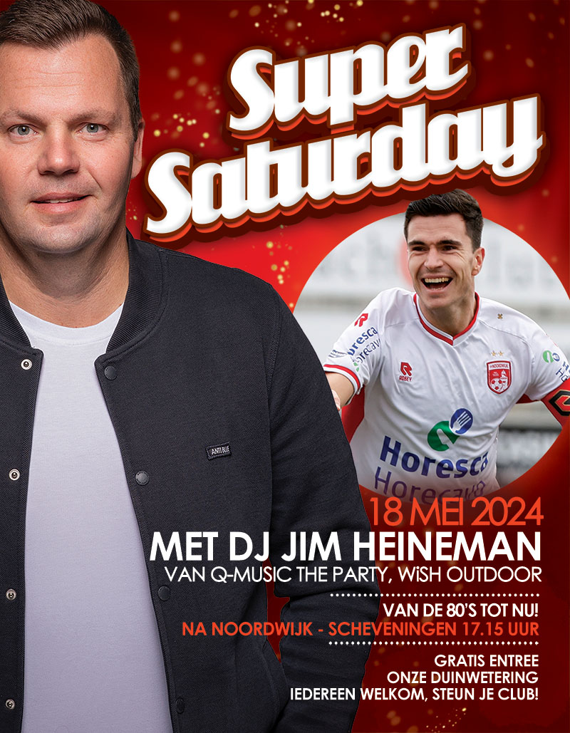 De eerstkomende Super Saturday is op 18 mei 2024. Direct na Noordwijk – Scheveningen vanaf 17.15 uur in onze kantine met DJ Jim Heineman!